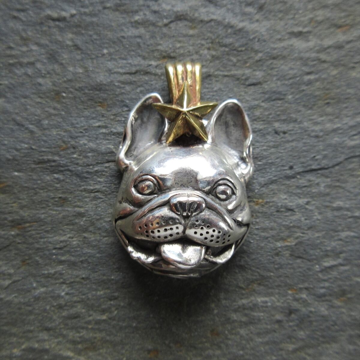 笑顔のフレンチブルドッグペンダントの裏側に筒状の部分を作り、ネジ式の容器にしてあります。